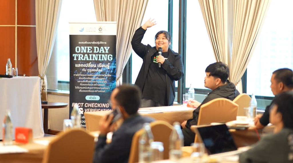 ขณะที่ ทีม Thai PBS Verify ยังได้เป็นผู้ถ่ายทอดความรู้เรื่องการ Fact-Check หรือการตรวจสอบข่าวปลอม โดยหนึ่งในหัวใจสำคัญของการอบรม คือการฝึกใช้เครื่องมือ Reverse Image Search การตรวจสอบด้วยเครื่องมือตรวจสอบต่าง ๆ ไม่ว่าจะเป็นการใช้ เครื่องมือตรวจสอบภาพ AI จากเว็บไซต์ต่าง ๆ การใช้แผนที่ Google Maps เพื่อตรวจสอบแผนที่รวมไปถึง การสังเกต เพื่อค้นที่มาของภาพว่าถูกนำมาจากเหตุการณ์ใด เคยปรากฏที่ไหนมาก่อน หรือถูกนำมาบิดเบือนบริบทหรือไม่ ซึ่งเป็นทักษะจำเป็นในยุคที่ภาพจากต่างประเทศหรือภาพที่สร้างด้วย AI ที่ถูกนำมาอ้างเป็นเหตุการณ์จริงบ่อยครั้ง
