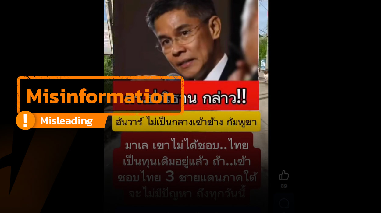 The post claiming that Assoc. Prof. Dr. Panitan accused the Malaysian Prime Minister of siding with Cambodia and “wanting Thailand’s three southern border provinces” is distorted information. The original clip from Amarin TV only discussed Malaysia’s role as ASEAN Chair and did not contain the harsh language circulated in the post.