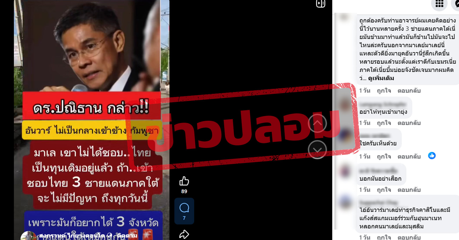 A post falsely claimed that Assoc. Prof. Panitan Wattanayagorn, a security and foreign affairs scholar, stated that Malaysian Prime Minister Anwar Ibrahim is biased in favor of Cambodia and made remarks about Thailand’s three southern border provinces.