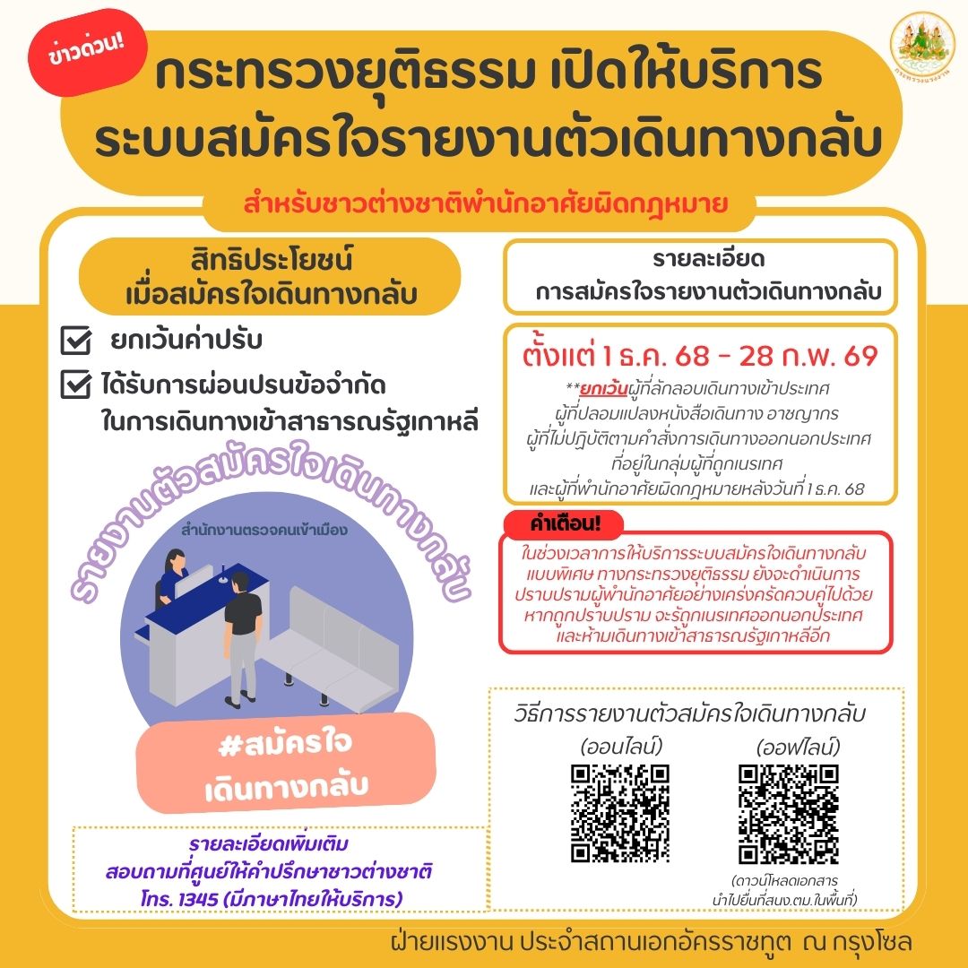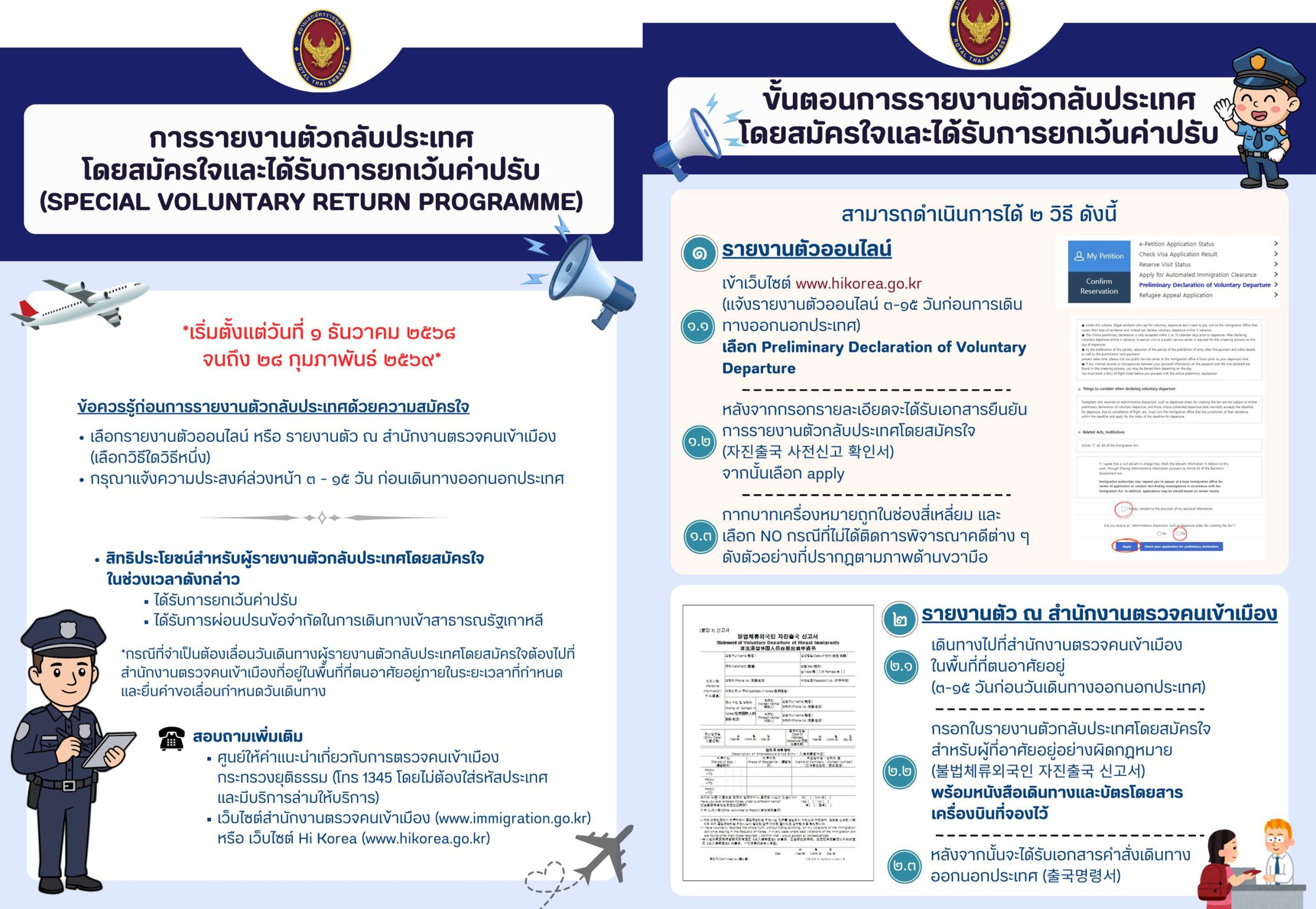 The Royal Thai Embassy in Seoul wishes to inform that the Korea Immigration Service has opened an opportunity for foreign nationals residing illegally to voluntarily report themselves and return home