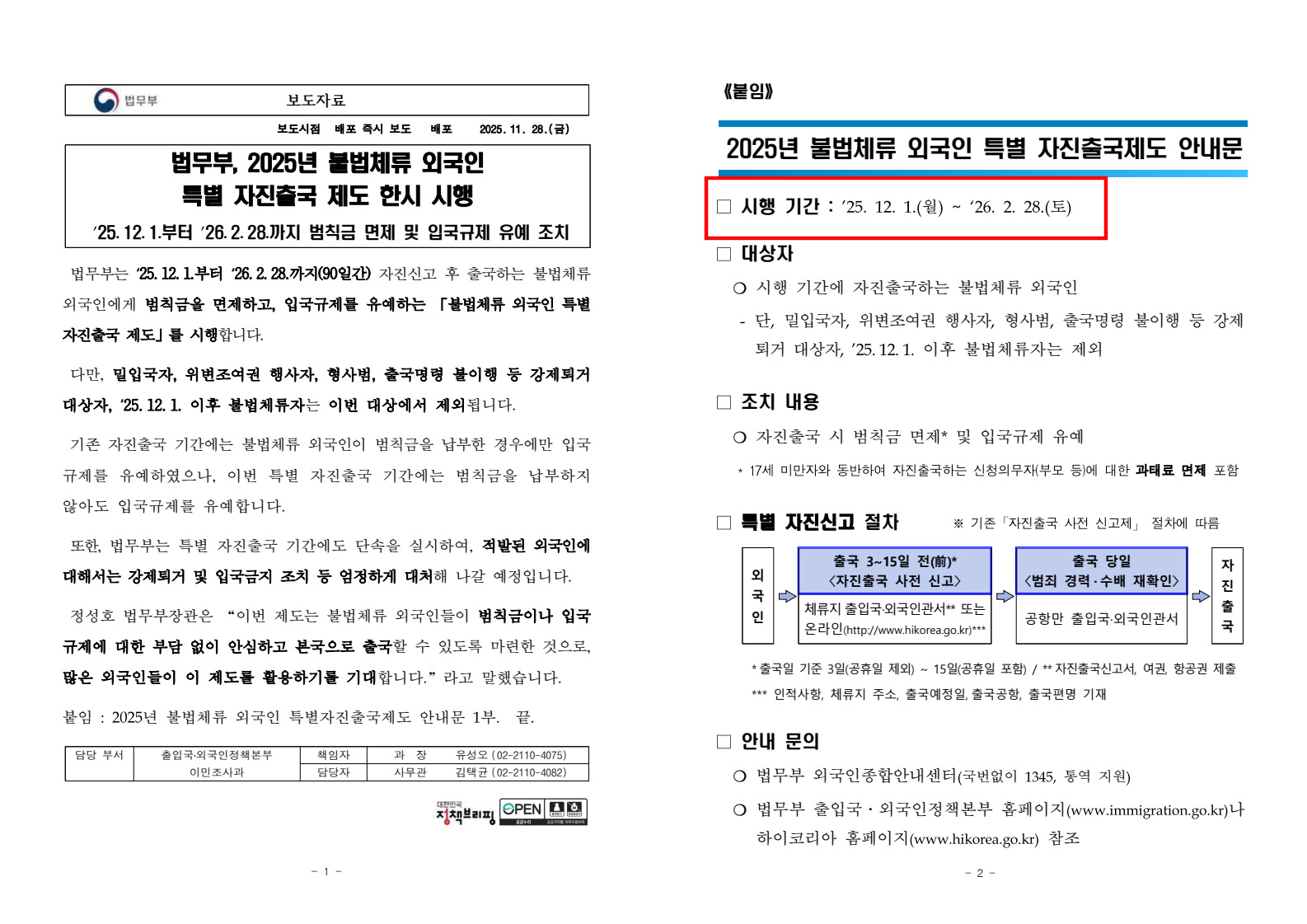 The announcement was made on November 28, 2025, and is overseen by the Immigration Investigation Bureau of the Korea Immigration Service, Republic of Korea.
