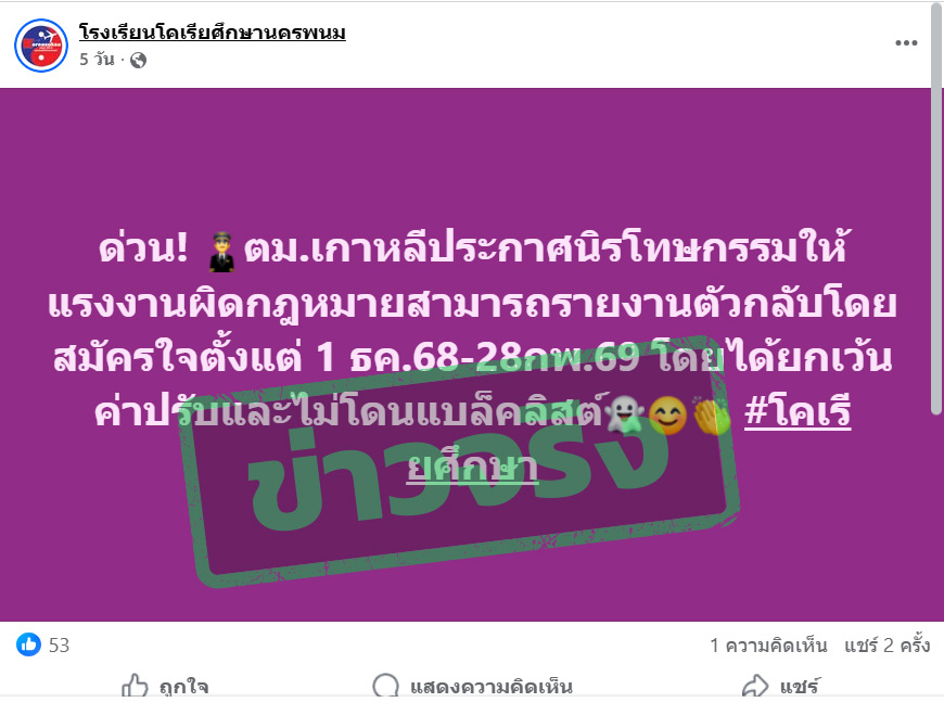 Verification found a post claiming that South Korea’s Immigration Office announced illegal migrant workers in the country could voluntarily report themselves to return home without fines and without being blacklisted from re‑entering South Korea.